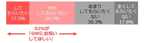 母の日の前週にあるゴールデンウイーク(GW)は、子どもと一緒に過ごしたり、旅行をするのにぴったり。そこで、「今年のGWに母の日のお祝いをしてもらいたいですか」と聞くと、「してもらいたい」の17.5%と「ややしてもらいたい」の34.5%を合わせて、52%の人が「GWにお祝いしてほしい」と回答。半数以上の人が、母の日を前倒しでお祝いする「フライング母の日」を好意的に捉えているようです。