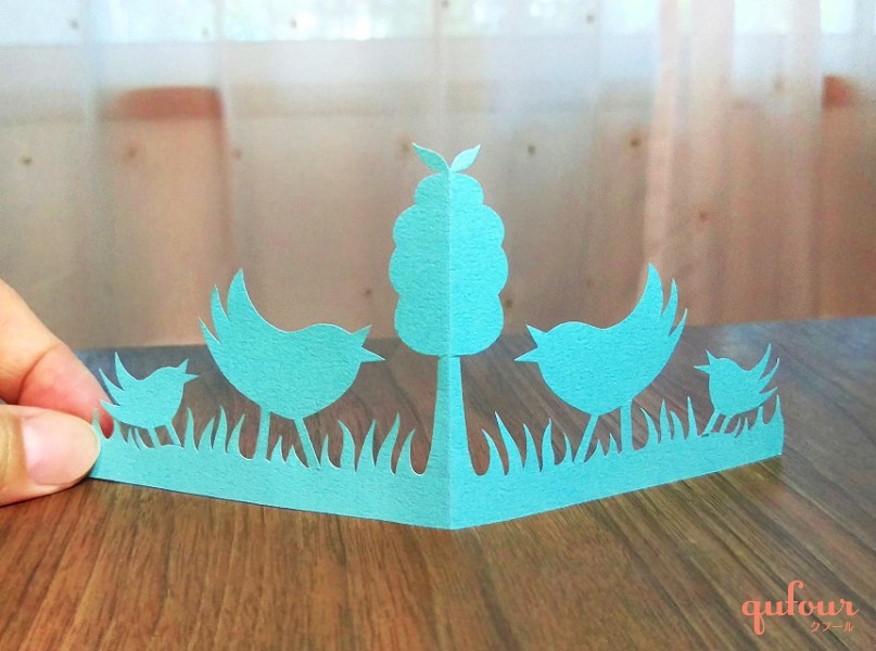 小さな鳥にも足を作れば、作品の完成です!折り線部分を指で広げて、テーブルの上などへ立ててみましょう。紙から絵が飛び出してくるような切り絵が出来上がりましたね。立てにくい場合は、広げた切り絵の上へ厚い本などの重しをしばらく乗せてから立ててみてください。木や草、鳥の形や大きさは、自由に変えて作ってみてくださいね。