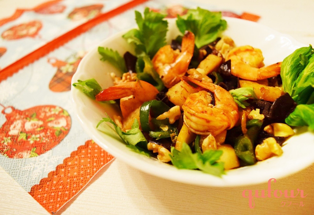 今回ご紹介するのは、アンチエイジング効果が期待できる「エビ」に、美肌食材の「黒キクラゲ」を合わせた、血行促進の「香味炒め」です。「ヤマイモ(長芋)」や「ピーマン」など、歯ごたえの良い野菜をたっぷり使うので、シャキシャキとした食感も楽しめます。