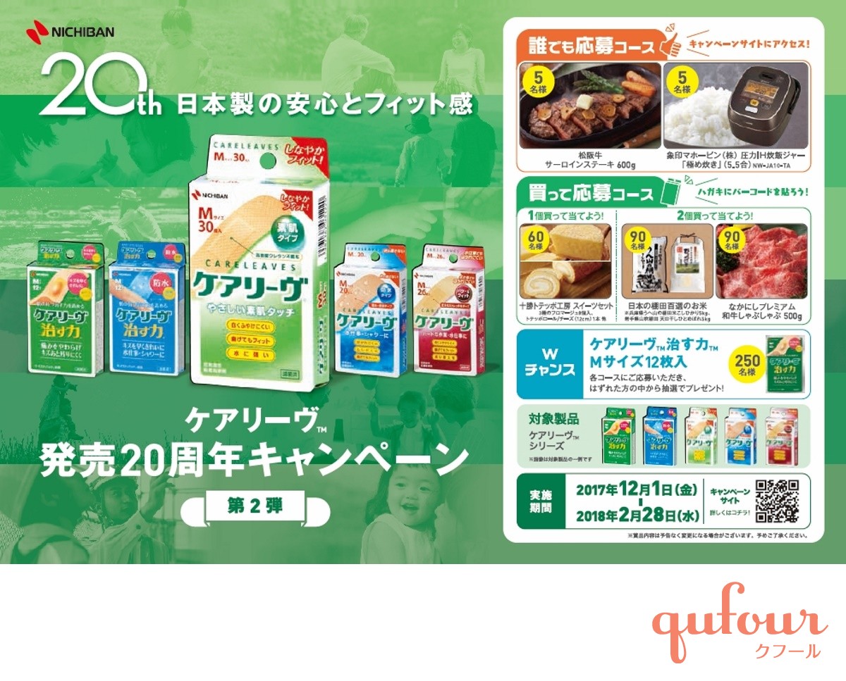 救急絆創膏「ケアリーヴ」を製造販売するニチバンは、「ケアリーヴ発売20周年キャンペーン第2弾」を2017年12月1日から開始します。抽選で合計500名に、グルメ食材やキッチン家電などが当たります。しかもキャンペーンは、サイトから誰でも応募できるオープンキャンペーンと、ケアリーヴを購入した人が応募できるクローズドキャンペーンの2本立てです。