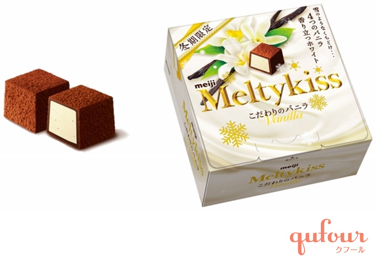 明治が20年以上に渡って毎年、冬期限定で発売しているチョコレート「メルティーキッス」シリーズに、新フレーバー「メルティーキッスこだわりのバニラ」が登場します。「華やか」「芳醇」「スパイシー」「スモーキー」の4つのバニラを組み合わせたホワイトチョコレートを、カカオの風味豊かなチョコレートで包みました。口に入れた瞬間から、豊かなバニラの織りなす風味の変化を楽しめます。