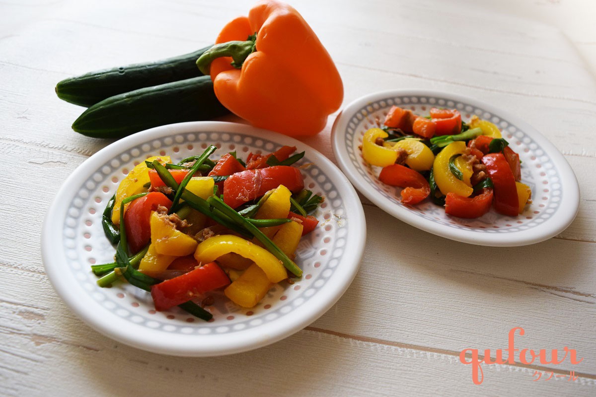 1.パプリカは種とヘタを取ってから1口大に、ニラは長さ3cmほどに、ミョウガは斜め切りにしておきます