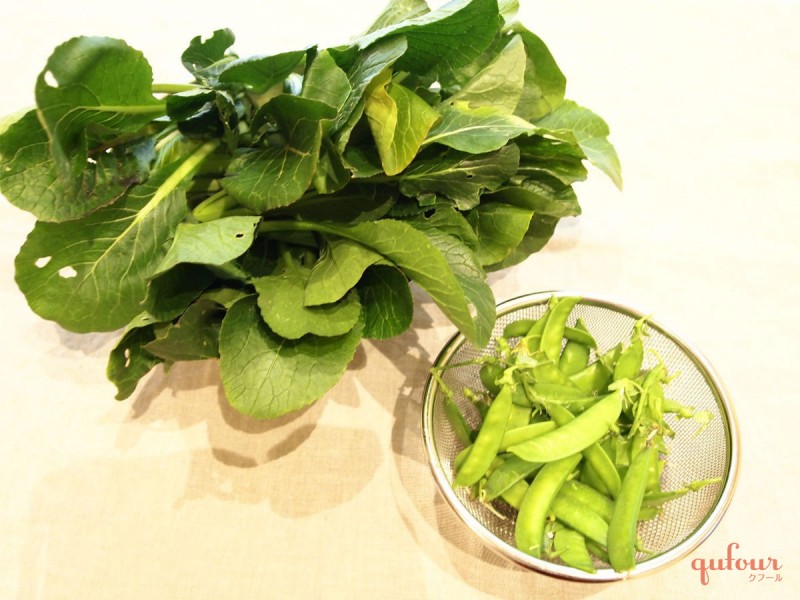 ・絹サヤ(100g):筋を取り除きラップで包み、600Wで1分加熱