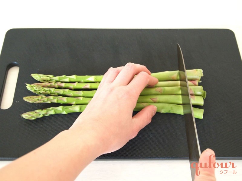 アスパラガスは、根元部分に繊維が多い野菜です。固くて食べにくく食感が損なわれるので、根元から1~2cmの部分は切り取ります。また、切り取った部分から3~4cmは皮が厚いため、包丁やピーラーで皮を剥きましょう。そのほかアスパラガスには、三角形のハカマが付いています。口当たりを良くするためには、ハカマを包丁やピーラーで取り除きましょう。下処理が終わったら、下茹でする場合は1本のまま、炒める場合は料理に合わせてカットして火に掛けます。