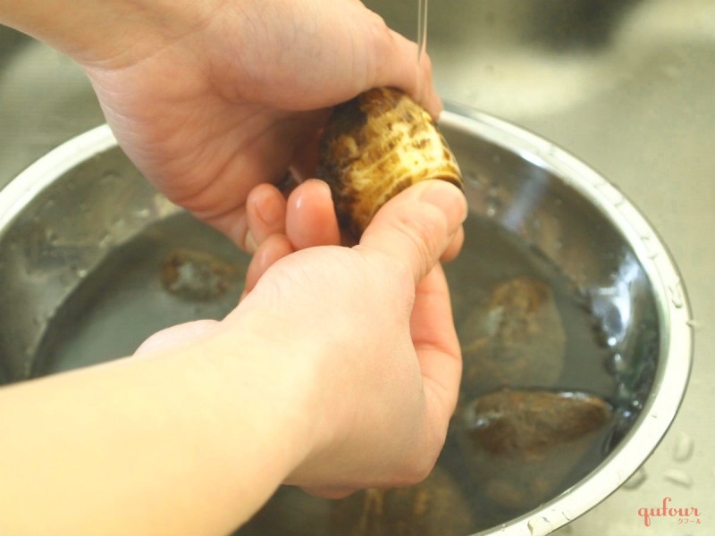 皮付きのまま下茹でする方法もあります。包丁で剥くよりも薄く皮が剥けてボミが少なくなるほか、里芋のねっとりとした風味を楽しめますよ。里芋の泥や汚れをきれいに落とし、上部と下部を切り落とします。切り落としておくと、皮が剥きやすくなるからです。鍋へ里芋と水を入れて、竹串が通るくらいまで茹でましょう。粗熱を取ったら、皮を剥きます。皮が剥きにくいときは、スプーンでこそげ取るようにすると簡単です。
