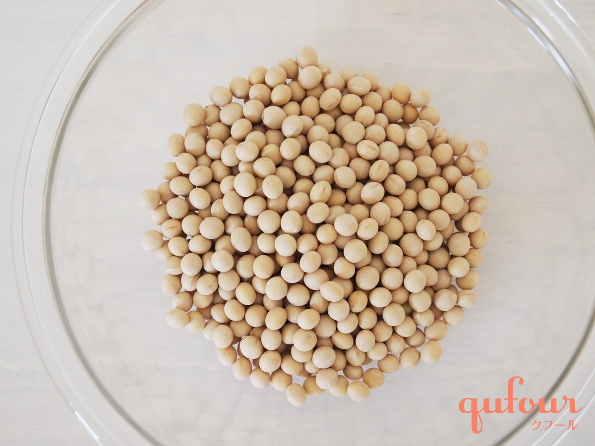 洗う前に、虫食いや欠けている大豆を取り除きましょう。乾燥大豆は、意外に汚れているので、しっかりと洗います。ボウルなどへ水と一緒に入れて、お米を研ぐように豆を擦り合わせ、水が濁らなくなるまで2~3回繰り返し、一旦ザルへ上げて水を切りましょう。それから大きなボウルか鍋へ移し替えて、大豆の重さの3倍以上の水を入れ、10~18時間置いて吸水させましょう。吸水時間は一定ではありません。大豆を2つに割って、全体が白っぽくなったらOKです。寒い時期は時間を長くします。大豆の芯まで吸水されると、加熱ムラができにくくなります。