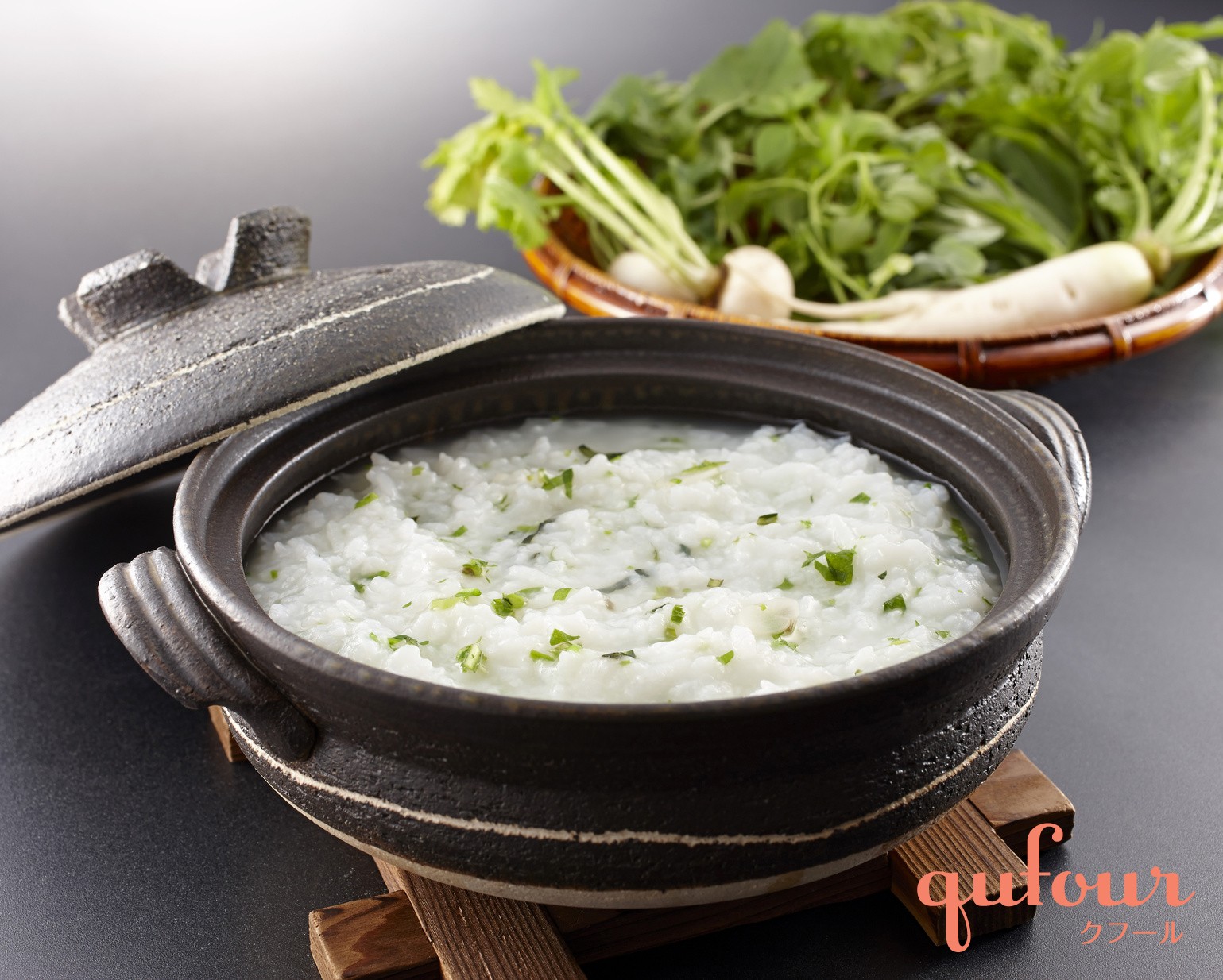 お粥が炊けたら、下茹でした七草を加えて軽く混ぜ合わせます。最後に混ぜる理由は、米と一緒に煮ると煮込み時間が長くなり、苦味やエグミが出てしまうからです。七草を混ぜて時間が経つと、風味が落ちてしまいますので、出来立てをいただきましょう。