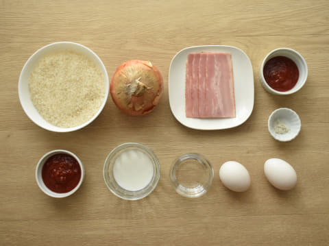 米は洗って炊飯釜に入れ、2合のラインまで水を注ぎます。米を浸水している間に、玉ねぎの1/2個はみじん切り、残りは薄切りにしましょう。ベーコンは細切りにします。米の上に、みじん切りの玉ねぎ、ベーコンをのせ、塩を振りかけて炊飯器にセットし、通常モードで炊飯します。