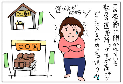 そう思いながら直売所がたくさん並ぶ通りを車で走ること数週間。「どこの店に入ればいいのか分からない!」という気持ちでなかなか入れずにいた。