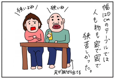 唯一だけど買い替えたいほどの不満が「我が家にはちょっと幅が狭い」のである。テーブルは120cmと、一般的な4人用テーブルの幅があるのだけど、夫が結構大柄なこともあり、2人で座ると足が3本しか入らない。どちらかの足を片方テーブルの脚の外に出す必要があるのである。これが地味にストレスなのだ。
