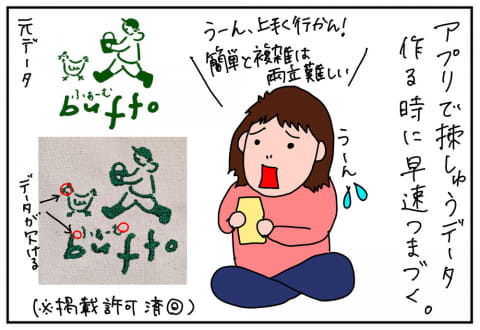シンプルで太い線で描いたイラストか、Artspiraのアプリ上で描いたイラストしか刺繍できないとなると、ちょっとできることが限られてくる。高くて難しいPCソフトを使って編集しなくてもアプリで簡単に刺繍ができるのは手軽さ、使いやすさの点では嬉しいけれど、手軽さゆえに痒いところには手が届かない。別のソフトで作った刺繍データをインポートすることもできるようだけど、プラスで10万を超える刺繍ソフトを買うのはダメ絶対!!!