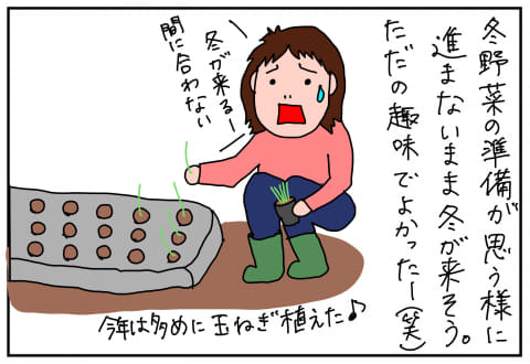 冬の野菜の準備は現在やっと7割といったところ。冬野菜の苗に並んで、ピーマンや唐辛子がいまだに青々と実っている光景は12月直前なのに不思議な感じだ。準備が遅れているとはいえ、去年まで借りていた畑より広いことで、いつもよりたくさんの野菜が育てられるのが楽しい。土質も良いし畑の借り換えは良い選択だったと思っている。