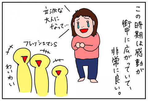「地下鉄のホームで、そんなに広がるのは邪魔だなぁ」なんて一瞬思ったりすることもあるけれど、数カ月後に配属先が決まると、同期全員が集まるということはほぼなくなるので、この期間ってとても貴重でかけがえのない時間だよなぁって思うと、これまた何だか感動して泣きそうになる(笑)。この季節の光景は感動の宝庫だ。あぁ、若者よありがとう。