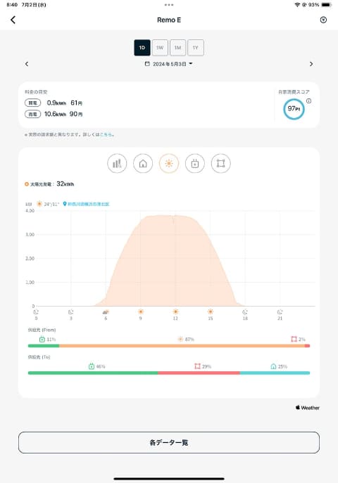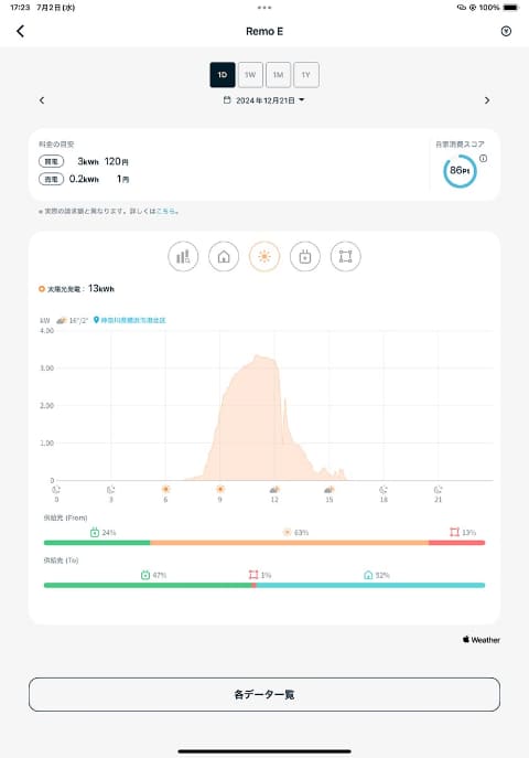 2023年10月に日産の電気自動車サクラを家庭用蓄電池として導入して運用開始した結果、家の屋根で昼間に発電した電気をサクラにためて、夜間にその電気を使うことができるようになった。