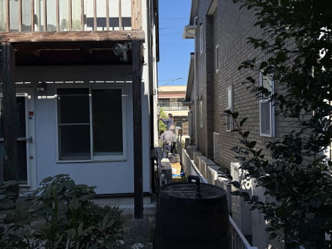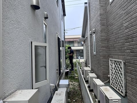 その後、また連絡がくると、「今度は隣の家からのエアコン室外機の熱風を防ぐための衝立を設置したい」とのこと。確かにお隣さんの室外機が、うちに向かってズラリと並んでいるので、夏はそこから熱風が出てくるし、ウチからもお隣に向けて室外機から熱風が出ていくから、まさにここは熱の吹き溜まり地帯にはなっている。とはいえ、それなりに風通しがあるから、見た目ほど酷いわけではなく、お隣との境にベニア板でエアコンの排気を遮断したところで、効果が出るとはまったく思えないけれど、試したいというのだから、止めるものでもない。