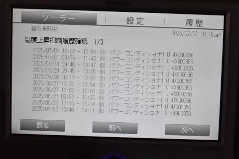 「やはり、これまでと変わらない」ということをシャープに伝えたところ、改めてサービス担当者がやってきて、再度いろいろとチェック。モニターにおいて、一般ユーザーには見ることができない、サービスマンモードのような画面を表示させた結果、ちょうど4kWで擦り切れる前のタイミングで、温度抑制のアラートが頻繁に出ていることが発覚。どうもパワコンが熱で不具合を起こしているようなのだ。