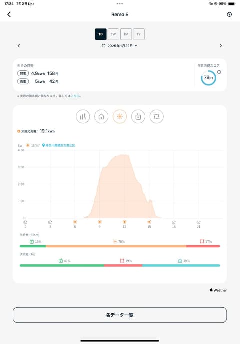サクラの蓄電池容量は20kWh。一般家庭の消費電力量は1日10kWh程度といわれているので、余裕で2日間分は使えると思っていたのに、実際には1日持つかどうかだったということがすぐに判明。その後の計測により、ひどい時はためた電気の40%も取り出せないことが分かったのは、前回の記事で書いた通り。