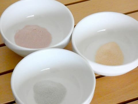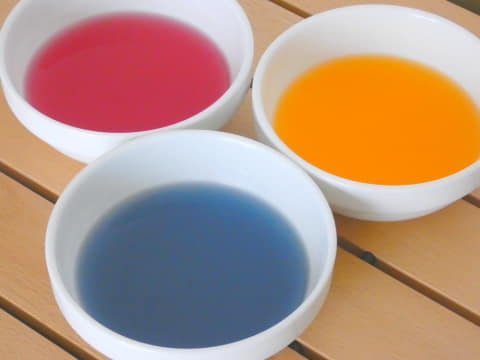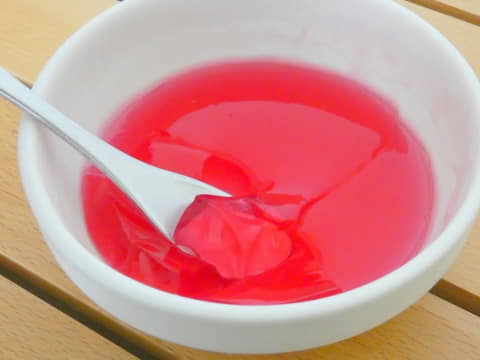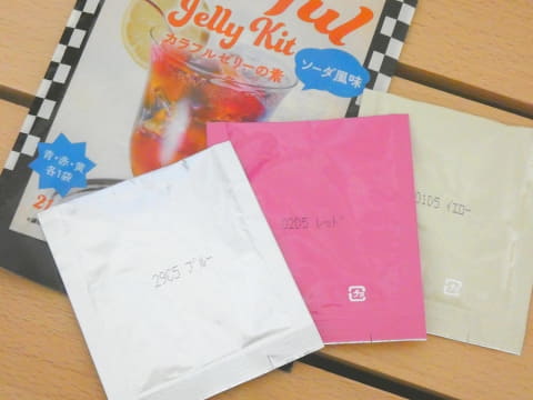 本品は、青色、赤色、黄色のゼリーの素のセットです。作り方はいたってシンプル。まず、それぞれのゼリーの素を別々の耐熱容器に入れ、水100mlを加えて溶かし、ゼリー液を作ります。あとはラップをかけて、電子レンジで1分加熱するだけでOK。