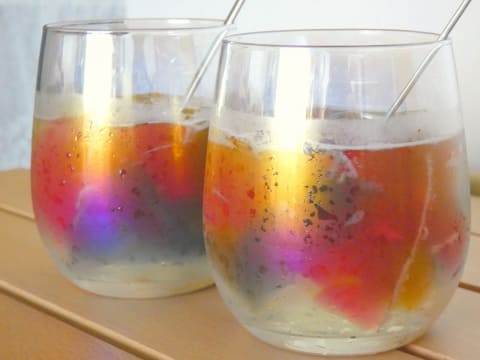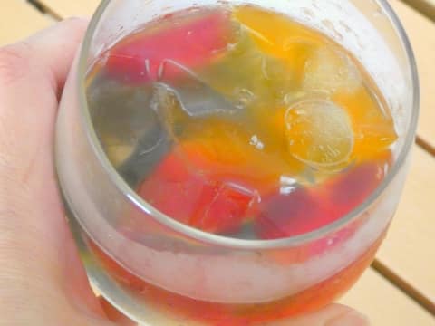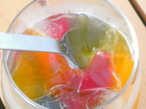 できあがったゼリーをそれぞれ粗めにカット、またはクラッシュして深めの容器に混ぜながら入れ、炭酸飲料を注ぐと、彩りの良いゼリードリンクが完成します。
