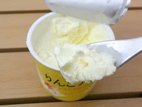 バターが使われているので、味がこってりしていそうなイメージでしたが、実際に食べてみると濃厚ではあるものの、くどさはなく、ふんわりとした口あたり。アイスクリーム用スプーンがスーッと入る、なめらかアイスクリームでした。アイスに混ぜ込まれたシャキシャキのりんごの果肉もさっぱりしていておいしかったです。