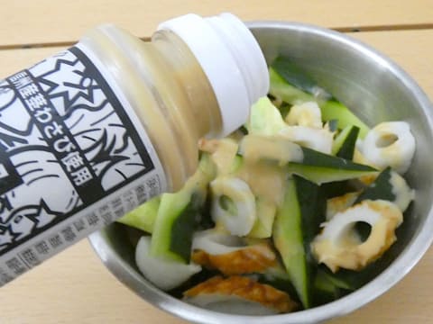 ディップソースなので、お好みの野菜につけてもおいしく食べられますが、本品はドレッシングのようにかけて使えるのも特徴です。夏野菜の定番“きゅうり”とちくわを食べやすい大きさにカットして本品をかけるだけで、お酒のお供にもぴったりな一品が完成します。