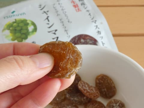 ドライ・シャインマスカットは半生製法で作られており、中にジューシーさが残っているのが特徴です。見た目は大きめの干しぶどうですが、実際に食べてみると、マスカット風味のゼリーのようです。生のシャインマスカットとは味わいも風味も異なり、正直なところ、そのまま食べるなら、筆者は生タイプが好みですが、使い方やレシピへの活用方法によっては、ドライタイプの方が相性が合さそうだなとも思いました。