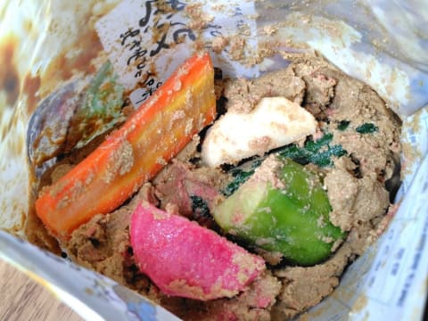 漬け上がった野菜は、ぬかをとって水洗いすれば食べられます。