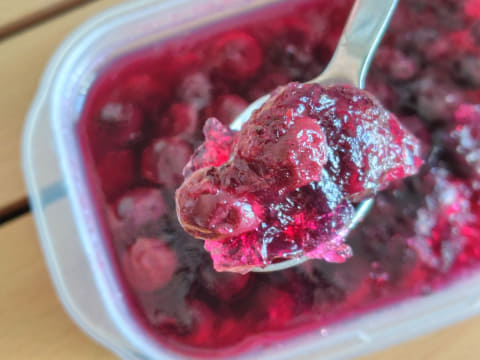 筆者おすすめの使い方は、実とシロップの両方を使って作るゼリーです。寒天またはゼラチンを加えて冷蔵庫で冷やし固めるだけなので、作り方も簡単。ブルーベリーの果実がゴロゴロ入った、ちょっと贅沢なフルーツゼリーを楽しめます。
