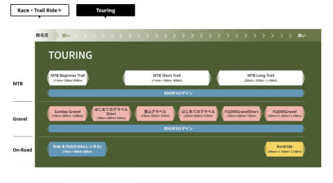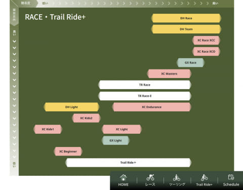 一方、レースよりもっと気軽に参加できるのが、ツーリングなどのライドプログラムです。ガイド役のスタッフの先導で比較的ゆったり走れるもので、ダウンヒルを含むトレイルライドにグラベルライド、オンロードのグループライドなどがあります。走行距離や対象年齢などが異なるたくさんのメニューから、自分の経験値や体力レベルを考慮して選びたいところです(公式サイトでは各メニューの難易度目安も分かるようになっています)。