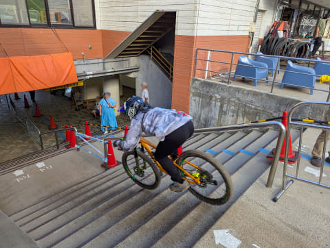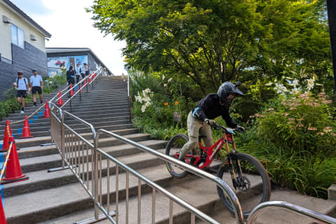 筆者自身、1カ月ほど前に初めて体験したダウンヒルですが、その時はおっかなびっくり走っていた段差だらけの狭い山道を、ものすごい勢いで次々と下っていきます。目の前で見られるだけあって大迫力なうえ、乗り方やライン取りなどを観察しているだけでも勉強になるなあと感じることしきりです。