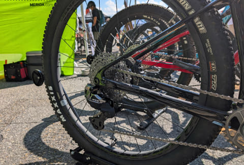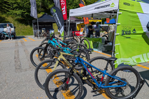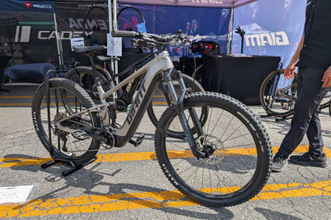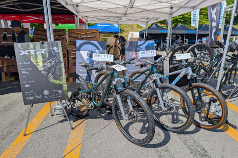 メーカー各社が出展しているブースエリアでは、MTB関連のサイクルギアが販売されていたり、試乗車が用意されていたりします。気になる最新モデルを借りて会場内の空きスペースで乗り心地をチェックするのもいいですし、それ用に設定された試乗コースでじっくり性能を体感するのもOK。e-MTBの試乗車もあったので、筆者も思わずお借りしてしまいました。