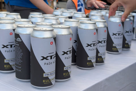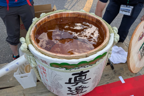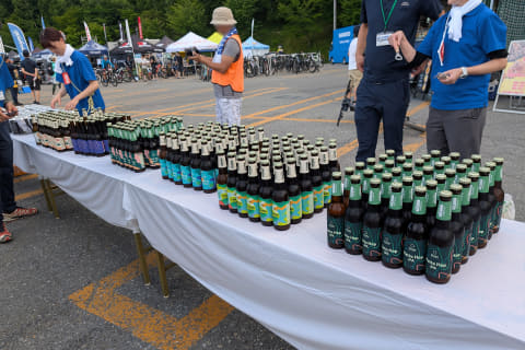 そして、初日にひととおりのレース・ツーリングプログラムが終了した夕方17時過ぎから、お待ちかねのウエルカムパーティ。今年は地元店のジビエサンドに加えて、諏訪に酒蔵をもつ宮坂醸造の日本酒「真澄」が樽で振る舞われました。数百本の缶・瓶ビールも用意されましたが、なかでもシマノの新MTBコンポ「XTR」の名を冠した特別なクラフトビールは圧倒的人気で、あっという間に配布が終了。