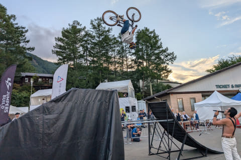 ウィンターシーズンはスキー場ですが、雪のない季節は「富士見パノラマリゾート MOUNTAIN BIKE PARK」として、本格的なトレイルライドやダウンヒルが楽しめるようになっている同所(ハイキングも人気のようです)。シマノバイカーズフェスティバルは、その設備やコースの一部を使用する形で実施されています。