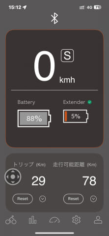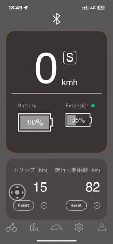 レンジエクステンダーを動作させるには車体本体の電源が入ってることに加え、本体の電源をオンになっていることが条件。これを確認したあと、JGR1.1用に設定されているスマホアプリ「BESV SMART PLUS APP」を立ち上げると、車体側バッテリー、レンジエクステンダーそれぞれのバッテリー残量の表示が出る。