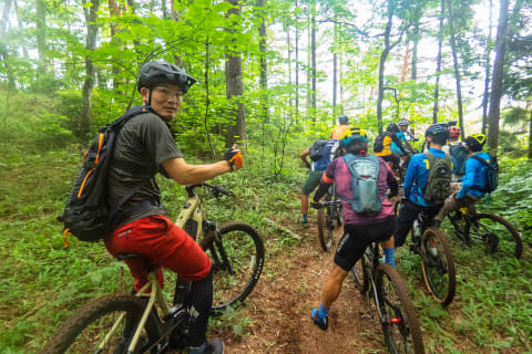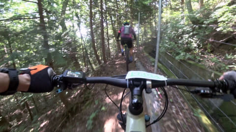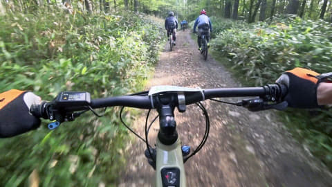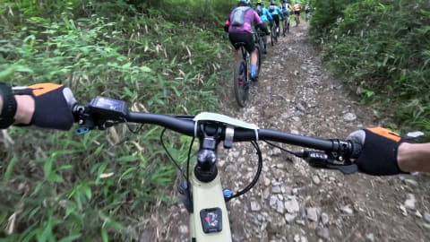初めて走るコースで、それなりにいいペース。滑りやすい箇所や段差の大きな箇所もいくつかあって、思わず悲鳴を上げてしまう場面もなかったとは言えませんが、総じて怖さよりも爽快感が勝ります。おそらくMTBに乗り慣れている他のライダーがいるのも心強く、経験の浅い筆者にとっては後ろについてその走行ラインを参考できたのも、怖さをあまり感じずにスムーズに走れた要因かと思います。