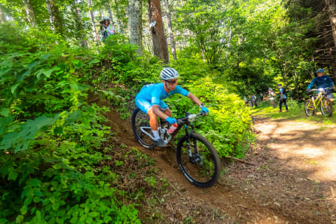 ちなみに初心者向けには「MTB Beginner Trail」というプログラムもあるのですが、このMTB Short Trailでもそんな風に走行ペースの異なるグループで分かれるので、何度かトレイルコースやダウンヒルを走ったことのある人ならMTB Short Trailも危なげなく、自分のペースで走れるでしょう。筆者は、コースの一部を往復して走る「おかわり」があるとのことで、ガンガン走りたいグループに加わることにしました。