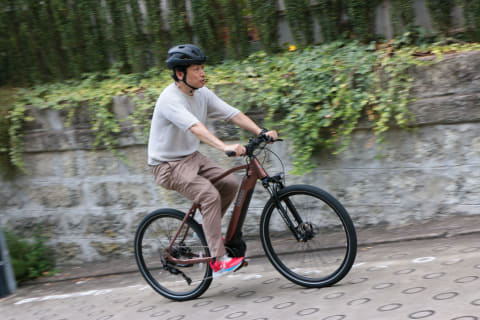 実際に乗ってみても中林編集長は「やはりクロスバイクタイプがいいなと思った」とのこと。一般のクロスバイクに比べると上体が起きた乗車姿勢になるので、アシストのあるe-bikeでももう少し前傾姿勢で乗りたいと感じたようです。e-bikeだとあまり強くペダルを踏む必要はありませんが、速めのペースでペダルを回すような乗り方をするのなら前傾姿勢のほうがしやすくなります。