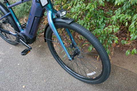 乗ってみて感じるのは、その軽さ。バッテリー容量が抑えられていることもあって、今回試乗したモデルでは一番軽量です。その軽さと、700×35Cという大径タイヤの組み合わせで、アシストが効かなくなる24km/h以上の速度でもラクに巡航できます。