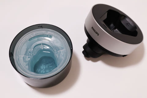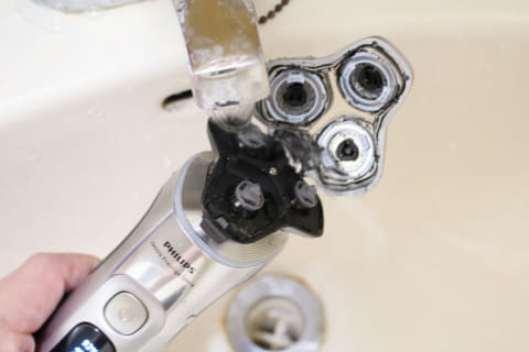 毎日のお手入れは非常に簡単です。ワンタッチでシェーバーヘッドを開き、水(40℃前後のぬるま湯を推奨)で流すだけでOK。その後はシェーバーヘッドを閉じて水を切り、乾燥させるだけです。ヘッドが小型のため水滴があまり付着せず、乾燥も早い印象でした。