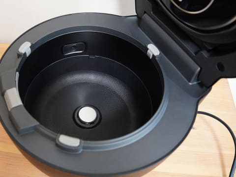 本体サイズは、28.6×30×22.9cm(幅×奥行き×高さ)。パッと見は、一般的な直方体の炊飯器に比べて大きそうに見えたが、実際にキッチンに設置してみると、円形でも浮かず、内鍋の形状に対してデッドスペースが少なく、フットプリントは意外にコンパクトに収まる。壁や他のキッチン家電とのすき間にキッチンツールを置いたりもできる。