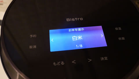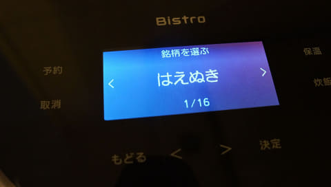 白米・無洗米の場合の選択肢は、ビストロ炊飯・銘柄炊き分け・高速・炊込み・すし・カレー用・冷凍用・おこげ・おかゆ・エコ炊飯の10通り。ここで銘柄炊き分けを選んだ後は、銘柄を指定する。プリセットされた銘柄は73種類だ。