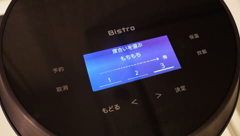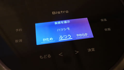ビストロ炊飯と銘柄炊き分けコースを選択すると、さらにそれぞれ食感を選ぶことができる。ビストロ炊飯は、ふつう・かため1~3・やわらか1~3・もちもち1~3・しゃっきり1~3の13通り。銘柄炊き分けは、ふつう・かため・やわらかの3段階で選択可能だ。