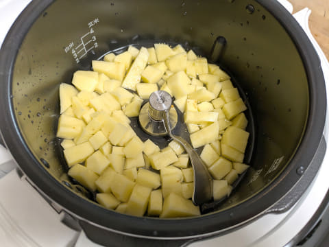 皮を剥いたじゃがいもを切って、コンソメと水を入れたらあとはスイッチを押すだけ。約30分後には、加熱と潰す工程が完了します。