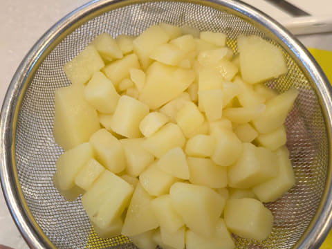 今回、少し水分量が多かったようで、シャバシャバの状態になっていましたが、水を切れば全く問題なし。ハムやきゅうりなどお好みの材料とお好みの味付けをすればポテトサラダが完成します。