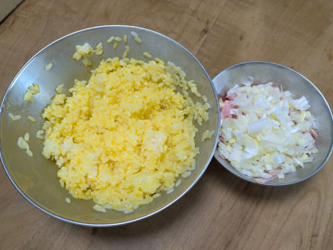 事前の準備は2つ。まずベーコンや長ネギなどの材料を細かく切ります。次に、ご飯をあらかじめ、溶き卵とよく混ぜておきます。塩胡椒や鶏がらスープなどの調味料もこのご飯の中に一緒に入れます。