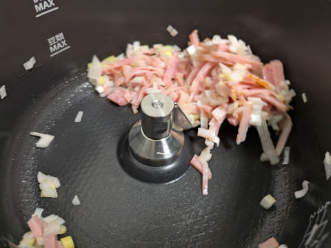 「炒めモード」で、「10分・150℃」に設定して、予熱が完了したらベーコンや長ネギを投入。ネギがしんなりするまで約2分ほど経ったら、ご飯を投入し、あとは完了を知らせる音が鳴るまでおまかせします。これだけでパラパラのチャーハンが完成しました!