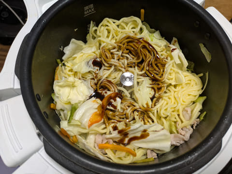 次に作ったのは、みんな大好きなソース焼きそばです。もともと簡単なメニューではありますが、ラクラクッカープロを使えばさらに簡単にできちゃいます。