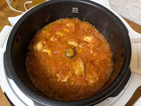 そもそも作り方が簡単。みじん切りした玉ねぎ2つ、トマト缶、鶏もも肉、おろしニンニク、バター、ハチミツ、塩こしょう、コンソメ、カレー粉などの材料を入れたらあとはスイッチを押すだけ! 予約調理の場合、調理完了時間を設定します。