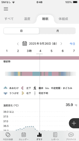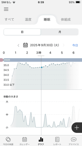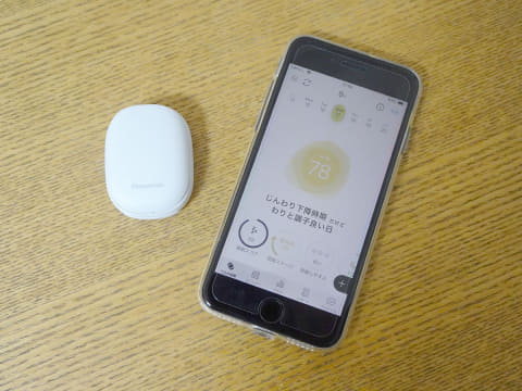 アプリへのデータ転送は、起床してスイッチを押すだけですぐに同期される。体温計測はピンポイントでなく、装着中の体温変化を1時間ごとに確認でき、これも装着型のデバイスだからこその機能といえる。