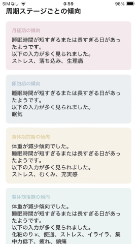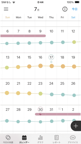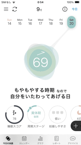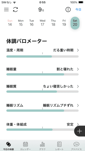 RizMoでは、他にも計測結果に基づいた1カ月後の体調予測や、生理周期全体を通じた体調の傾向レポート、アドバイスなども表示される。予測段階では月経周期に基づいた数値が表示されるが、データを転送するとその日の睡眠状態の結果に応じて、スコアが修正されるようになっている。